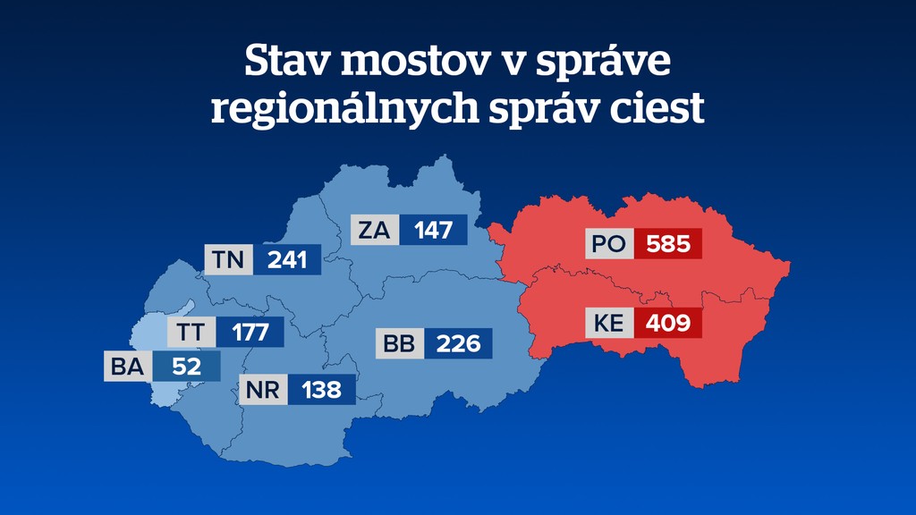 Slabú životnosť majú hlavne mosty na východe krajiny. Najhoršie sú na tom v Prešovskom, kde je v zlom až kritickom stave takmer 600 mostov.