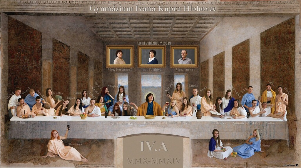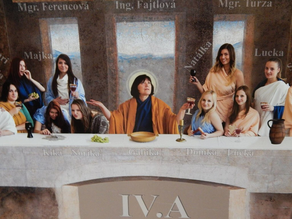 Do redakcie nám prišlo ďalšie tablo od študentov 4.A z Gymnázia Ivana Kupca v Hlohovci, ktorí si skutočne zvolili netradičný motív a pre niektorých ľudí aj poburujúci. Žiaci sú na table zobrazení pri poslednej večeri Ježiša Krista s apoštolmi. Presne podľa obrazu slávneho obrazu Posledná večera od Leonarda Da Vinciho.
