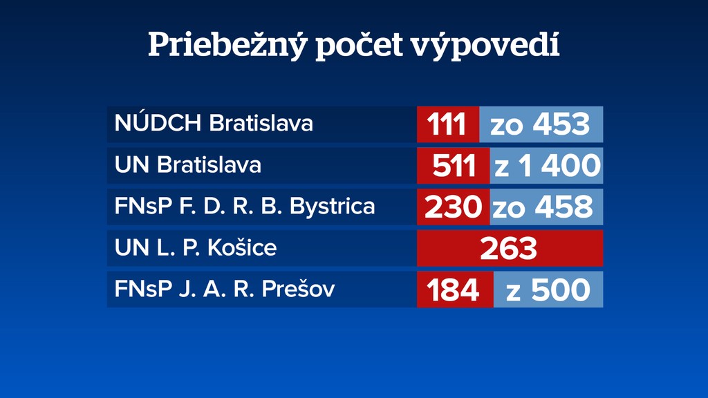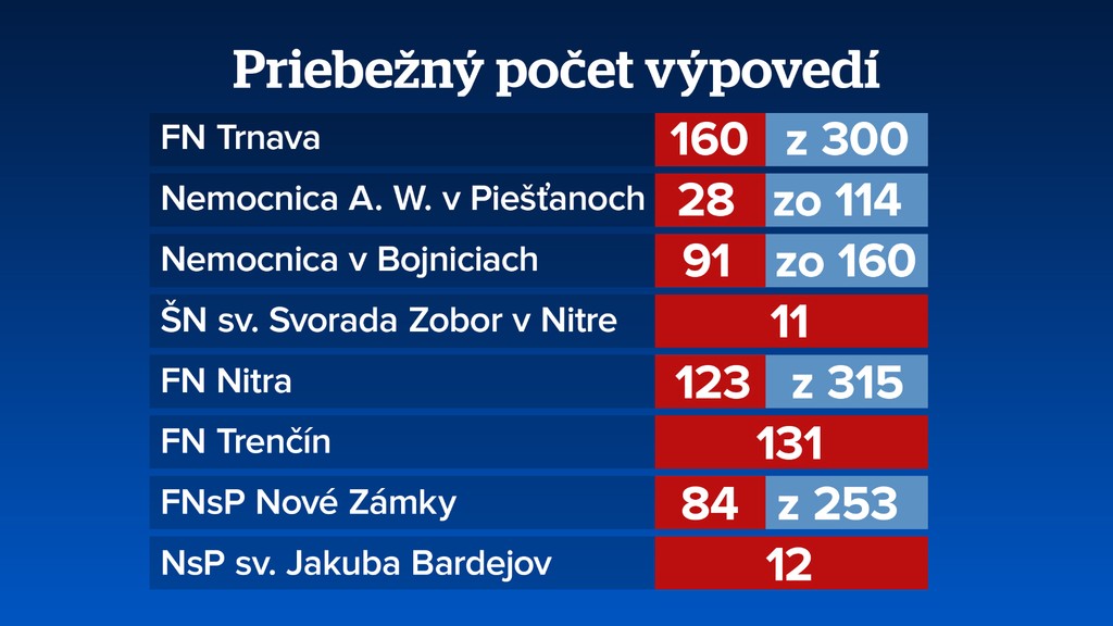 Zisťovali sme, aká je situácia v konkrétnych nemocniciach naprieč Slovenskom. Toto sú doposiaľ aktuálne čísla, ktoré nám doteraz poskytli. Niektoré o výpovediach informovať nechceli.