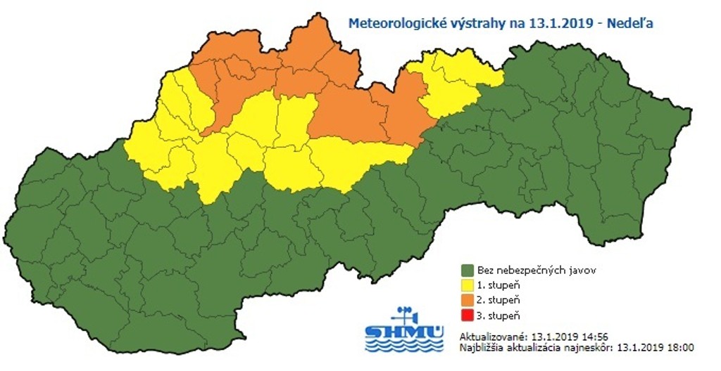 Výstraha druhého stupňa platí pre okresy Čadca, Bytča, Žilina, Kysucké Nové Mesto, Námestovo, Dolný Kubín, Tvrdošín, Liptovský Mikuláš a Poprad. Pre ďalšie okresy v Banskobystrickom, Trenčianskom, Prešovskom a Žilinskom kraji platí výstraha prvého stupňa. Napadnúť tam môže 30 - 50 cm.