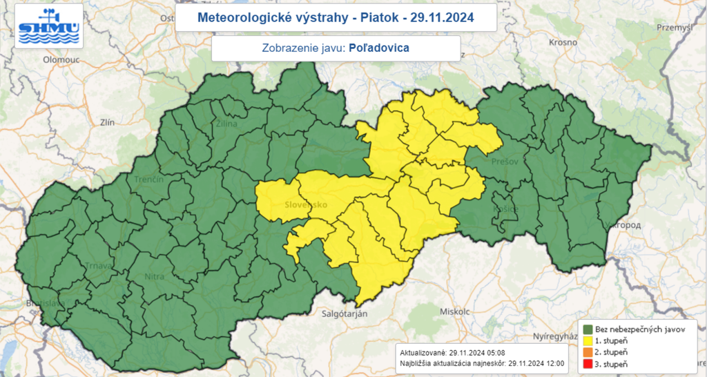 V piatok (29. 11.) nás čaká oblačný až zamračený deň, no zrážok bude menej ako vo štvrtok. Tie sa vyskytnú už len miestami. To však neplatí pre severnú polovicu krajiny, kde bude pršať na mnohých miestach, prípadne to budú prehánky a od nadmorskej výšky 600 metrov sneženie.
