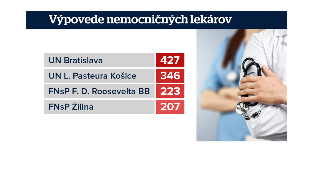 Najviac lekárov je aktuálne na odchode z univerzitnej nemocnice v hlavnom meste, je ich viac ako 400. Košická univerzitná nemocnica môže už o tri týždne prísť o takmer 350 lekárov. V banskobystrickej aj žilinskej nemocnici majú na stole viac než 200 výpovedí.