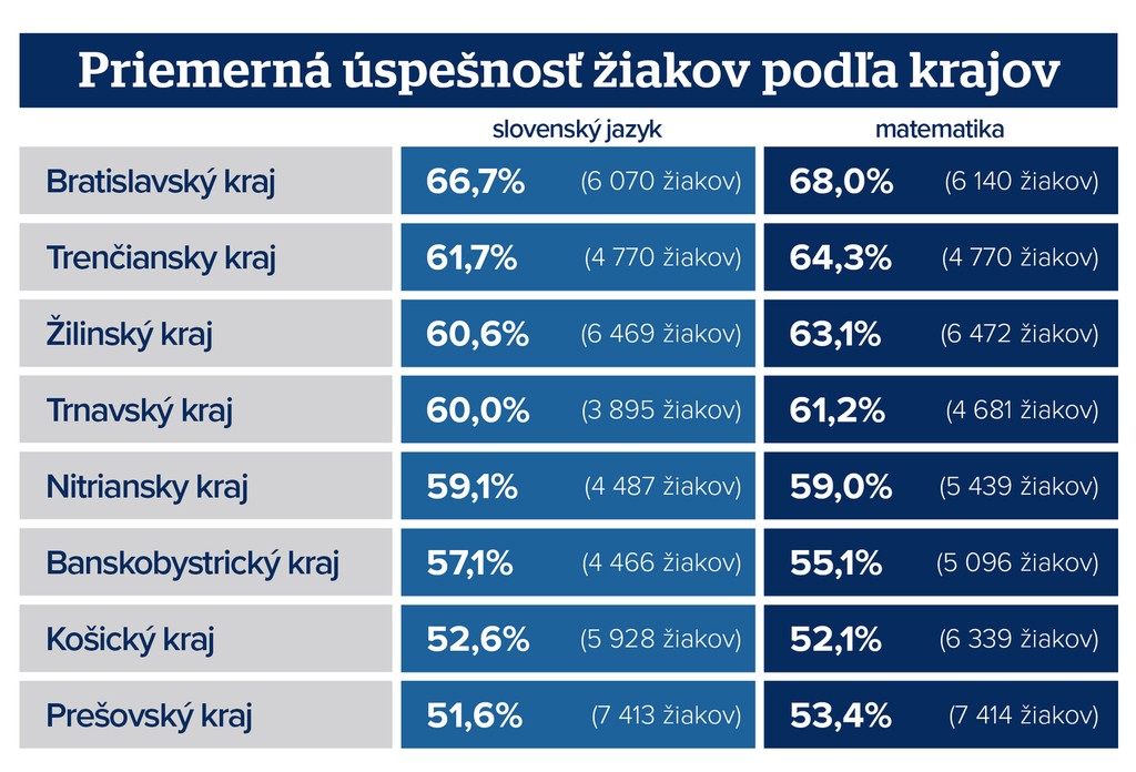 Najhoršie výsledky majú dlhodobo žiaci 5. ročníka z okresov Gelnica, Revúca, Rimavská Sobota a Kežmarok. Výsledky žiakov z týchto škôl sú takmer o polovicu horšie v porovnaní s výsledkami žiakov bratislavských škôl. "Rozdiel medzi výsledkami žiakov v okrese Bratislava I (73,8 percenta) a okrese Gelnica (38 percent) je v matematike takmer 36 percentuálnych bodov, čo zodpovedá 11 úlohám testu," priblížil rezort školstva.