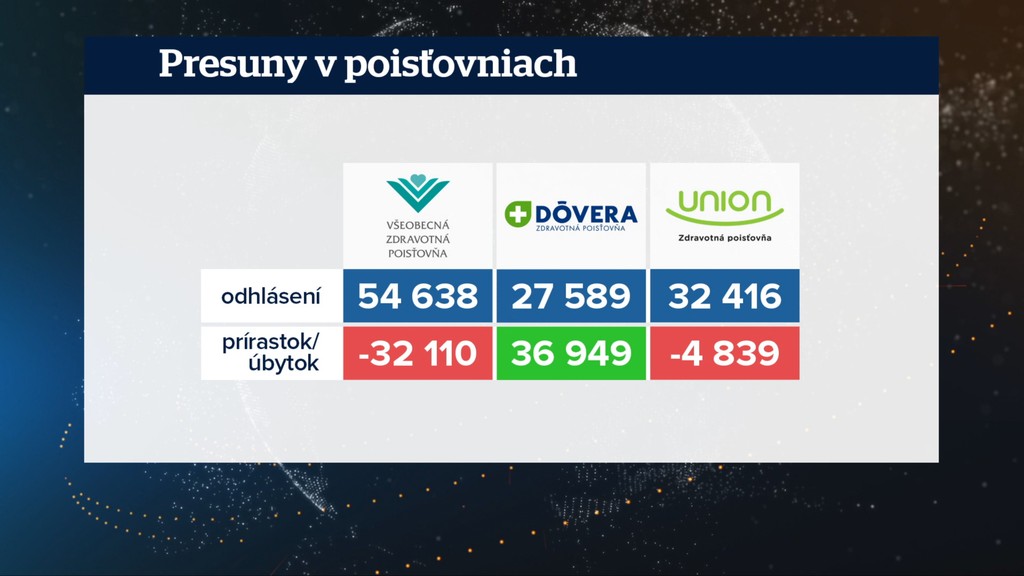Najväčší počet získala poisťovňa Dôvera, vyše 37-tisíc poistencov. Najviac poistencov sa rozhodlo odísť zo štátnej Všeobecnej zdravotnej poisťovne, ktorá príde o vyše 32-tisíc klientov. Poisťovňu Union opustí takmer päťtisíc poistencov.