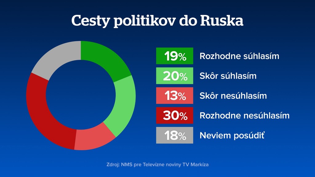 V prieskume sa anketári opýtali 1001 ľudí a výsledky sú takmer presne pol na pol. S cestami slovenských politikov do Moskvy súhlasí asi 40 percent opýtaných, proti je len o trochu viac.