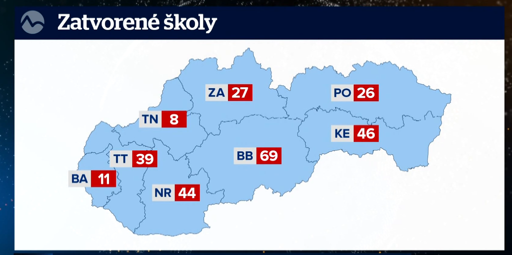 Pre vysokú chorobnosť majú deti základných, materských aj stredných škôl nečakané chrípkové prázdniny. Zatvorených je 270 škôl. Takto to vyzerá na mape.