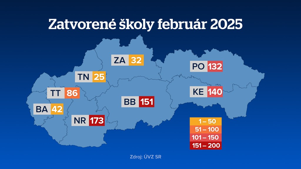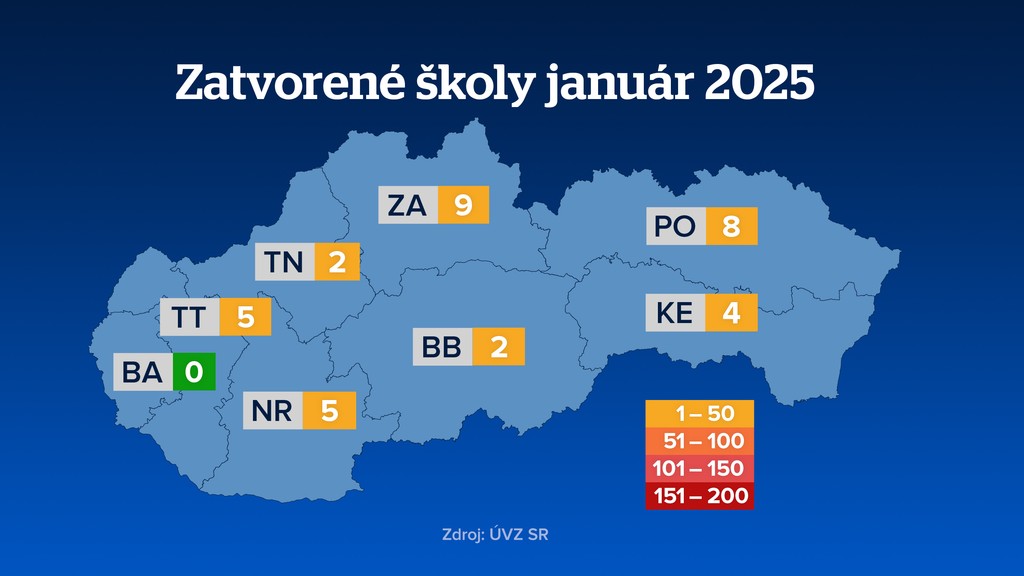 Vplyv to má, samozrejme, aj na školy, škôlky a jasle. Prvé z nich sa začali zatvárať pred dvoma týždňami. Najviac škôl je zatvorených v Nitrianskom a Banskobystrickom kraji. Naopak, najmenej, v Trenčianskom.
