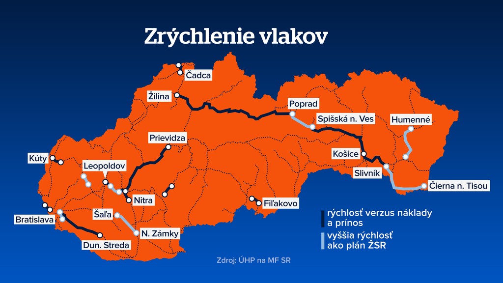Niektoré úseky majú priniesť lepšiu dopravu pre regióny a zrýchlenie je aj ekonomicky návratné. Príkladom je trasa z Bratislavy do Dunajskej stredy a zrýchlenie z 80 na 160 kilometrov za hodinu či trať medzi Košicami a Slivníkom, ktorú majú v rámci rekonštrukcie zrýchliť z 80 na 120 km/h.