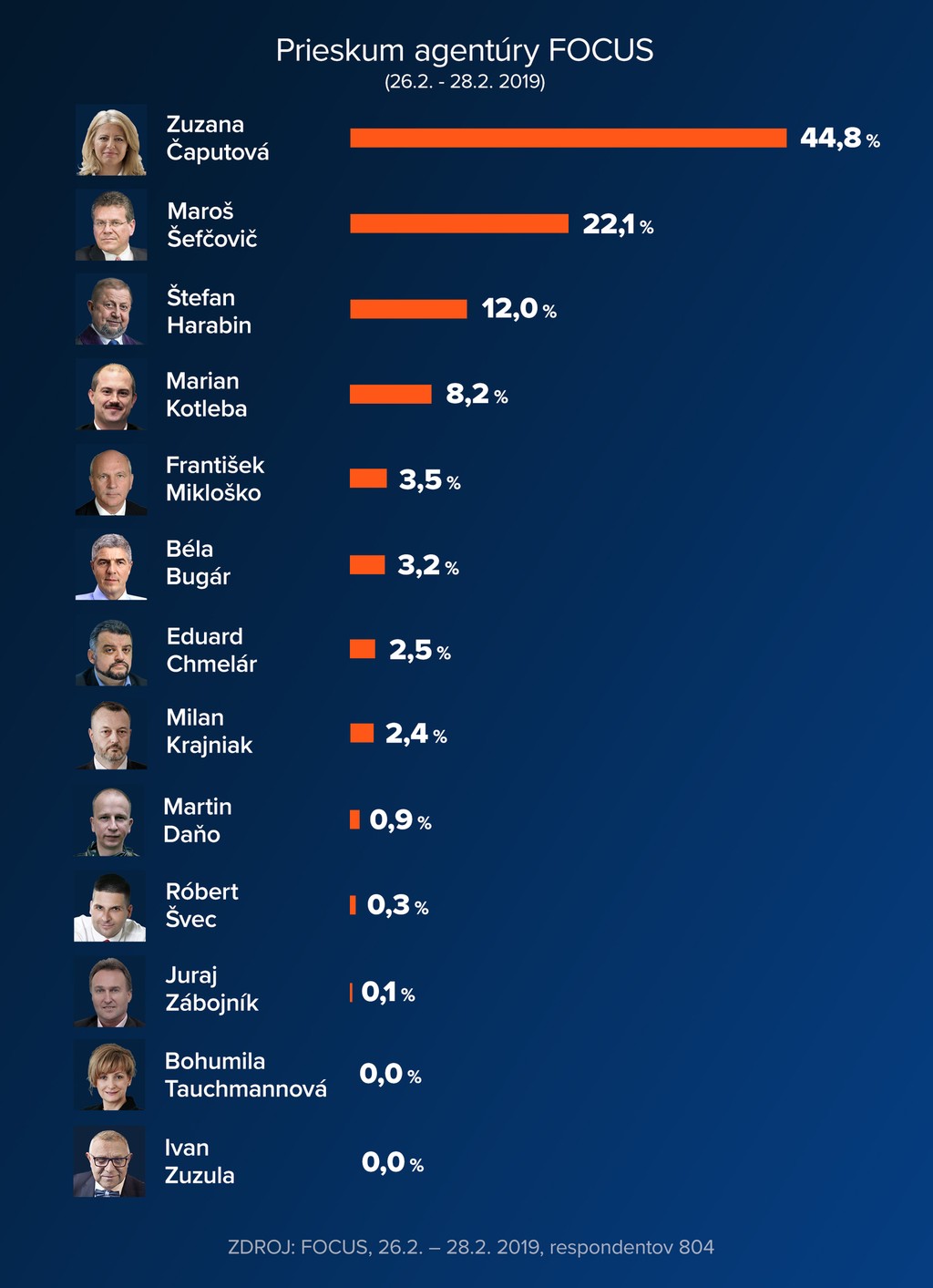 Zuzana Čaputová by získala v prvom kole 44,8 percenta hlasov. V boji o Prezidentský palác by sa v 2. kole podľa týchto výsledkov stretla s Marošom Šefčovičom, ktorému by dalo hlas 22,1 percenta ľudí.