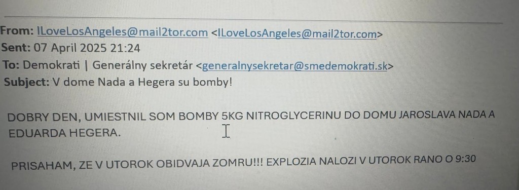 V dome bývalého premiéra Eduarda Hegera a predsedu Demokratov Jaroslava Naďa nahlásil anonym bomby. Informoval o tom Naď na sociálnej sieti a pridal aj fotografiu výhražného mailu.