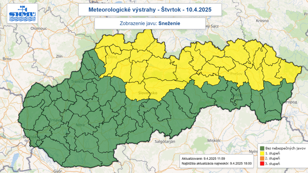 Meteorológovia predpokladajú, že počas noci môže napadnúť do desať centimetrov snehu. Vydali aj výstrahy prvého stupňa pred snežením. Platia vo viacerých okresoch Banskobystrického, Žilinského, Prešovského a Košického kraja vo štvrtok (10. 4.) od 2:00 do 8:00 h.