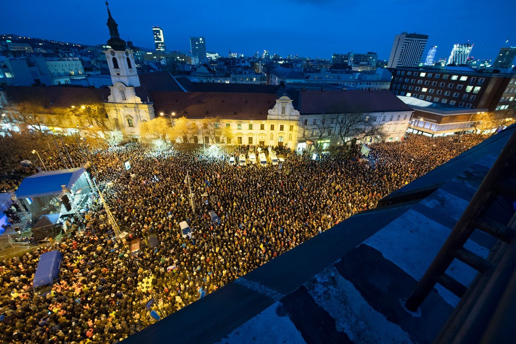 16. marca 2018 - Na bratislavskom Námestí SNP sa konalo druhé verejné zhromaždenie Za slušné Slovensko. Desaťtisíce ľudí požadovali predčasné parlamentné voľby a dôkladné a nezávislé vyšetrenie vraždy novinára Jána Kuciaka a jeho snúbenice Martiny Kušnírovej.