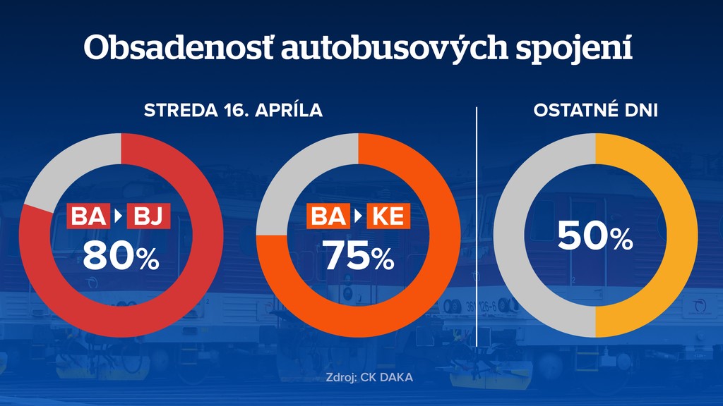 V stredu (16. 4.) a vo štvrtok (17. 4.) sú vlakové spoje najvyťaženejšie. Vlaky sú takmer plné, zostáva už len pár miest. Stále si však nejaké stíhate kúpiť a prázdniny si užiť doma. Najviac ľudí bude cestovať v stredu (16. 4.) z Bratislavy smerom na východ.