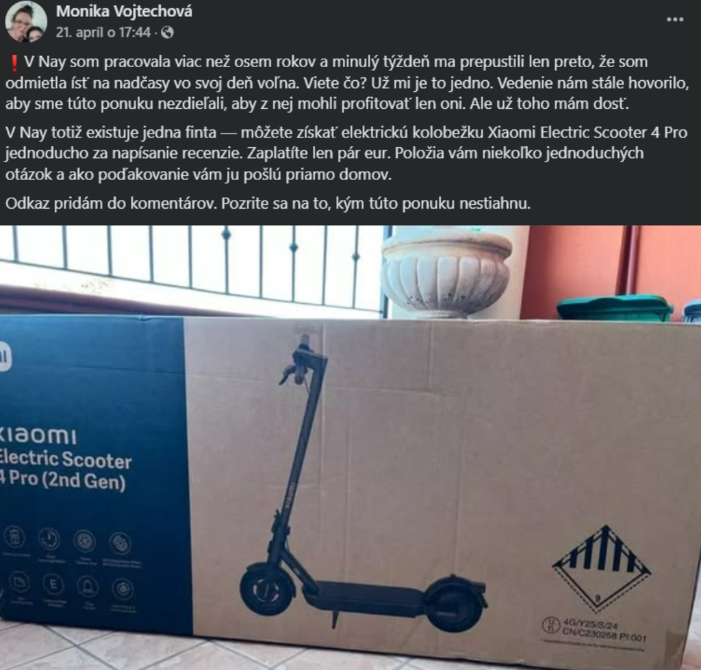 „V Nay som pracovala viac než osem rokov a minulý týždeň ma prepustili len preto, že som odmietla ísť na nadčasy vo svoj deň voľna. Viete čo? Už mi je to jedno. Vedenie nám stále hovorilo, aby sme túto ponuku nezdieľali, aby z nej mohli profitovať len oni. Ale už toho mám dosť. V Nay totiž existuje jedna finta — môžete získať elektrickú kolobežku Xiaomi Electric Scooter 4 Pro jednoducho za napísanie recenzie. Zaplatíte len pár eur. Položia vám niekoľko jednoduchých otázok a ako poďakovanie vám ju pošlú priamo domov,“ uvádza sa v jednom z príspevkov.