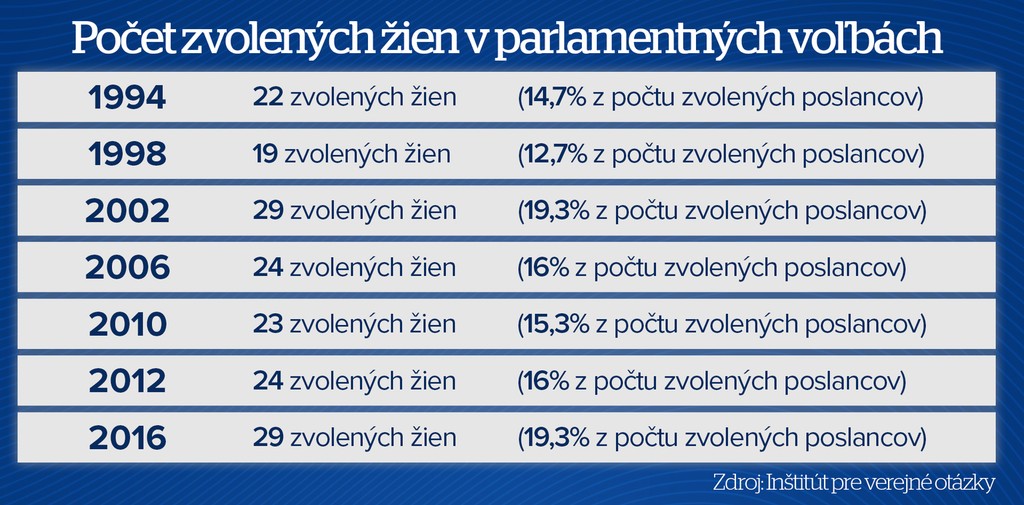 Najmenej ich bolo po voľbách v roku 1998. V parlamente zasadlo 19 poslankýň, čo bolo len necelých trinásť percent zo všetkých poslancov. Najvyrovnanejšie to bolo v rokoch 2002 a 2016, kedy sa zhodne prekrúžkovalo 29 žien. Stále to však je necelých dvadsať percent.