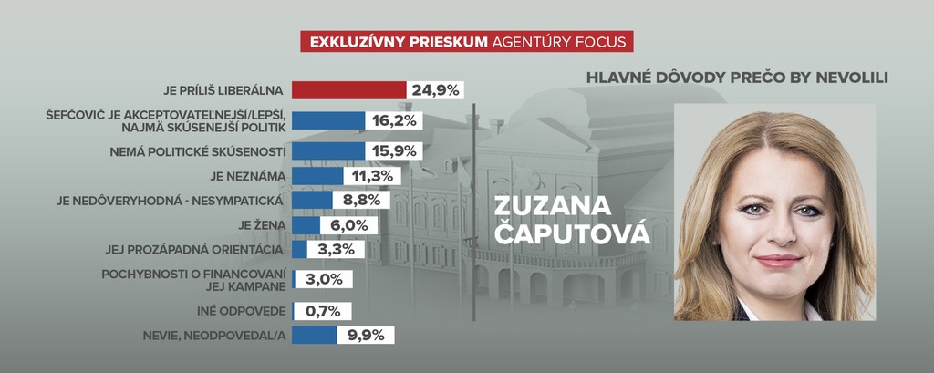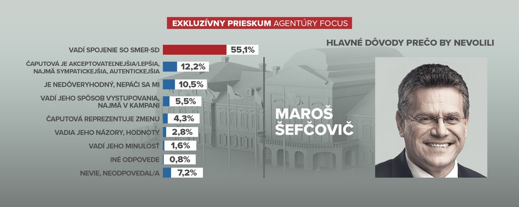 V prieskume anketári zisťovali aj hlavné dôvody, prečo ľudia nevolili Čaputovú a Šefčoviča. Hlavným dôvodom (až 55 percent voličov), prečo nedali hlas eurokomisárovi bolo spojenie s najsilnejšou vládnou stranou Smer-SD. Pre 12,2 percenta opýtaných bola akceptovateľnejšia a najmä sympatickejšia a autenickejšia protikandidátka