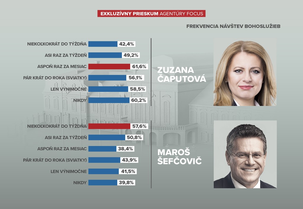 Maroša Šefčoviča by podľa prieskumu volili najmä ľudia, ktorí navštevujú bohoslužby niekoľkokrát do týždňa. Tesnú väčšinu získal aj pri tých, ktorí navštevujú svätostánok raz týždenne. V ostatných kategóriách uspela Zuzana Čaputová.