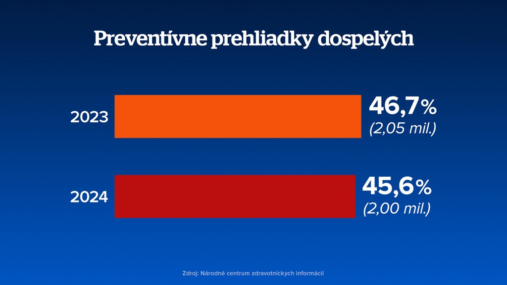 Dáta od zdravotných poisťovní ukazujú, že v posledných dvoch rokoch nebola na preventívnej prehliadke u všeobecného lekára ani polovica dospelých Slovákov. Mnohí idú do ambulancie až vtedy, keď ich niečo bolí.