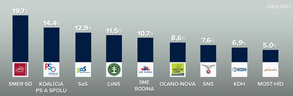 Prvenstvo v prieskume patrí Smer-SD s 19,7 percentami, čo by bolo 30 kresiel v národnej rade.
