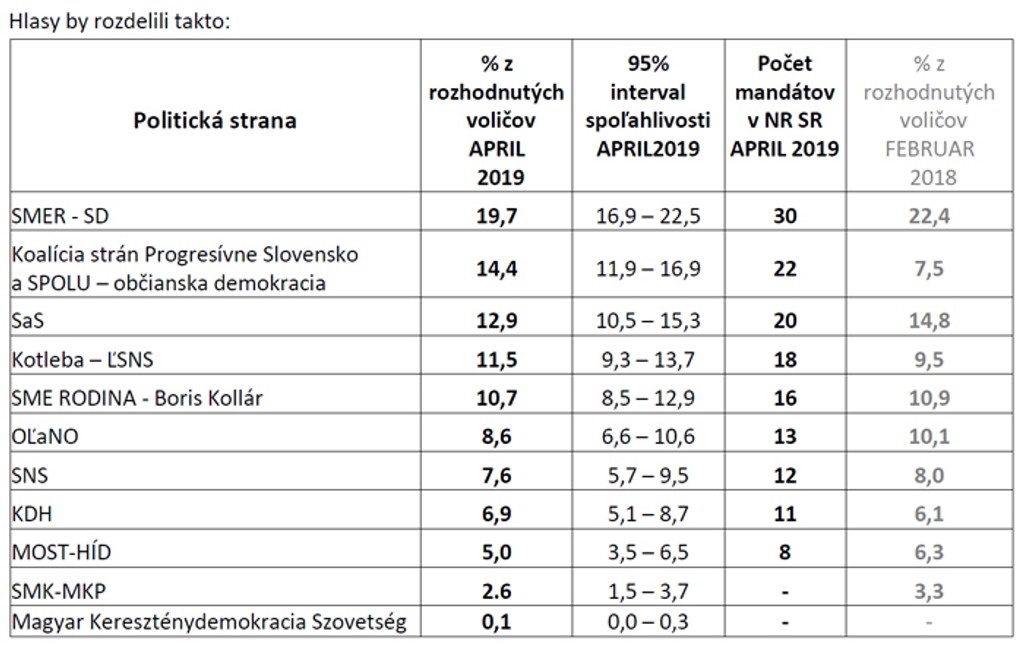 Podľa prieskumu by na štvrtom mieste skončila Sme rodina s deviatimi percentami, nasleduje OĽaNO s 8,3 percentami, SNS so 7,9 percentami a KDH so 7,5 percentami. Most-Híd by dosiahol 4,5 percenta a SMK tri percentá.