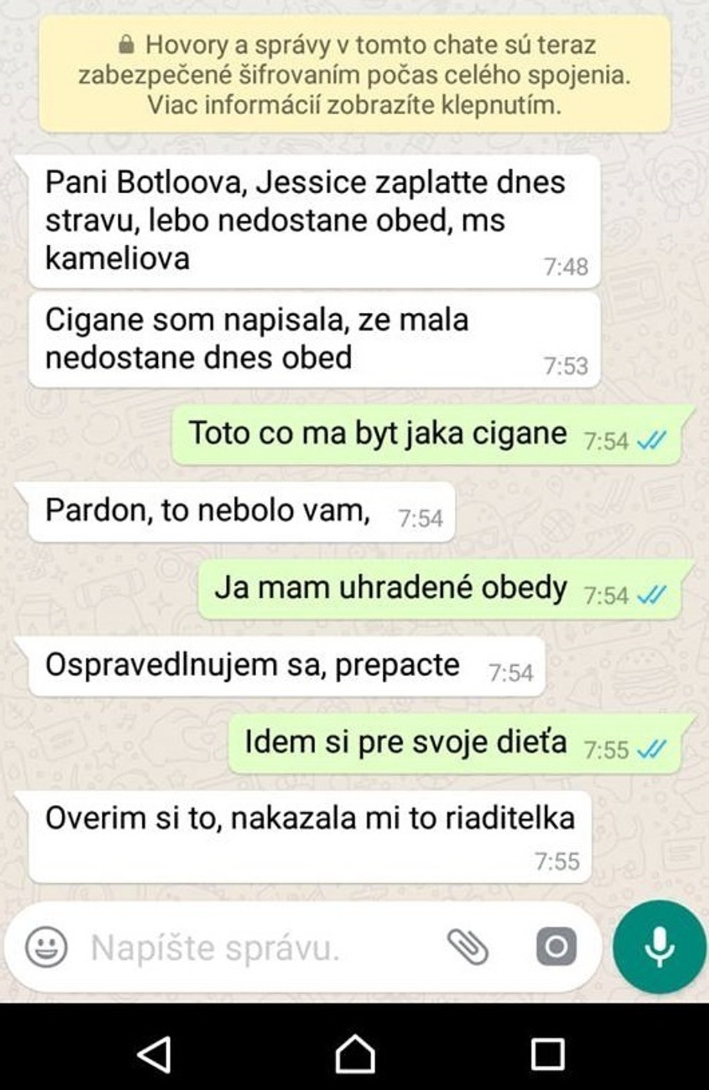 „Pani Botloova, Jessice zaplaťte dnes stravu, lebo nedostane obed," prišla matke od učiteľky prvá správa. Za ňou však nasledovala vyššie citovaná správa, ktorá mala mať evidentne už iného adresáta. Následne sa učiteľka ospravedlňovala, ale matka si už svoje dieťa prišla zo škôlky zobrať.