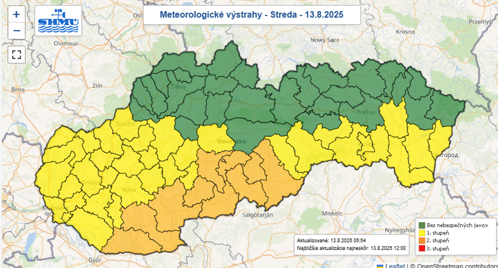 V stredu bude slnečno a veľmi teplo: 30 až 35 °C, na severe okolo 28 °C. Fúkať bude slabý, na západe miestami mierny južný vietor do 20 km/h. V južných okresoch platí výstraha druhého stupňa pred vysokými teplotami do 35 °C.