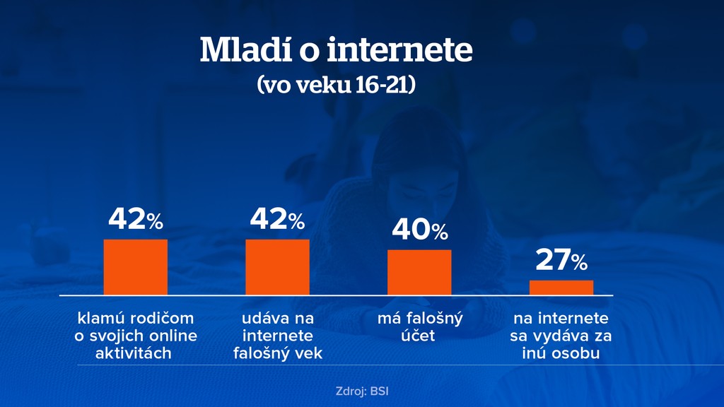 Zaujímavé je tiež zistenie, že necelá polovica mladých (42 %) o svojich aktivitách na internete rodičom klame. Ďalší majú falošné profily (42 %) a takmer tretina sa dokonca vydáva za úplne inú osobu (27 %).