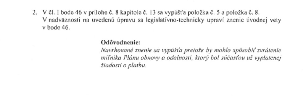 „Navrhované znenie sa vypúšťa, pretože by mohlo spôsobiť zvrátenie míľnika Plánu obnovy a odolnosti, ktorý bol súčasťou už vyplatenej žiadosti o platbu,“ píše sa v ňom.