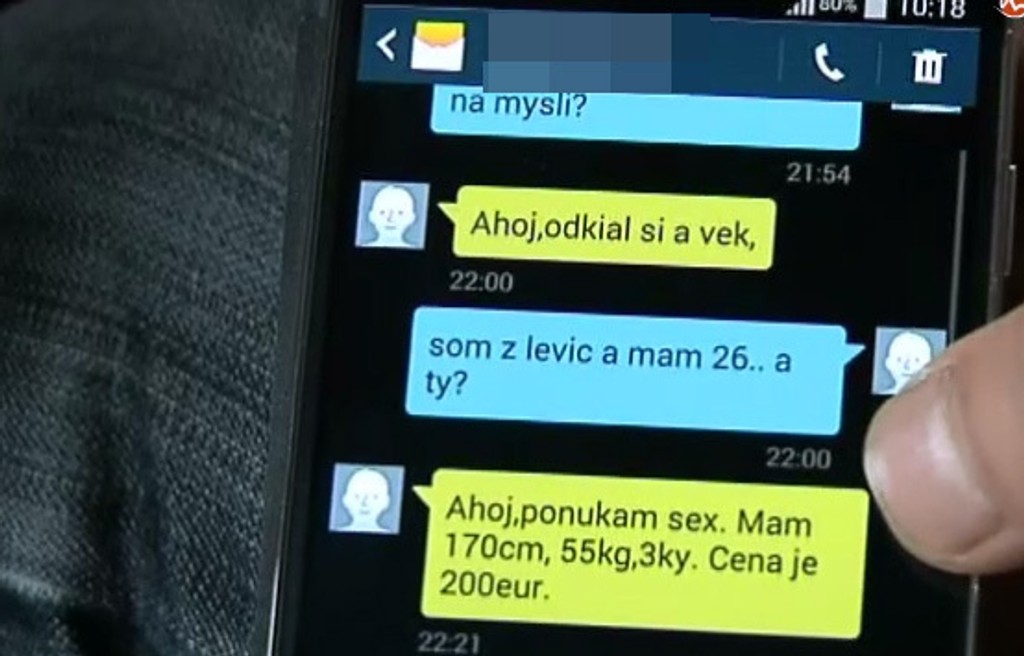 "Napísala mi výšku, váhu, veľkosť poprsia, že ponúka sex za 200 eur," povedal Erik. Služby odmietol, no o chvíľu prišla výhražná esemeska v znení: "Ty sa budeš s nami zahrávať? Nikol kvôli tebe odmietla zákazníka a musíš zaplatiť ušlý zisk, inak si ťa nájdeme do dvoch hodín."