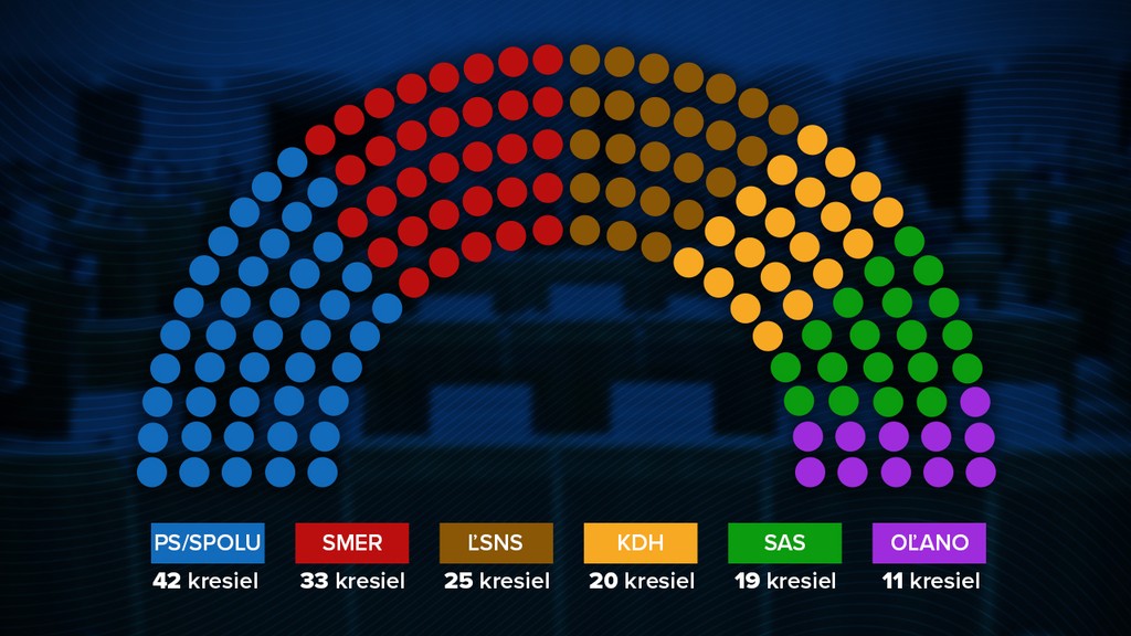 Najviac mandátov by malo PS/Spolu - 42, druhý Smer by obsadil 33 kresiel. ĽSNS 25, KDH 20, SaS 19 a posledné OĽaNO 11 mandátov.