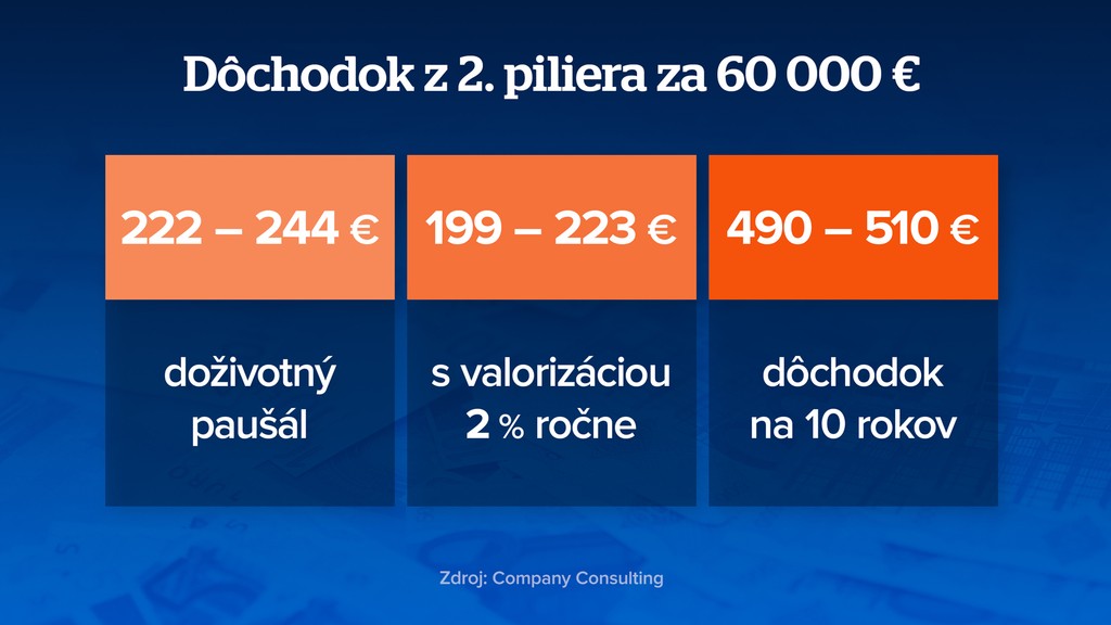 Keď budeme odchádzať do dôchodku, svoje investície si vyberieme. Ak to bude napríklad 60-tisíc eur, v životnej poisťovni nám to bude stačiť na doživotnú mesačnú rentu 222 až 244 eur. Ak budeme chcieť, aby sa renta každý rok zvyšovala, prvotná suma sa bude pohybovať medzi 199 a 223 eurami. A ak sa rozhodneme pre rentu len na desať rokov, mesačne budeme dostávať okolo 500 eur.