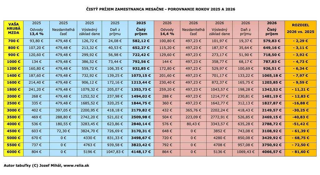 Odborník Jozef Mihál na sociálnej sieti zverejnil tabuľku, v ktorej porovnal mesačný čistý príjem zamestnanca v roku 2025 a 2026.
