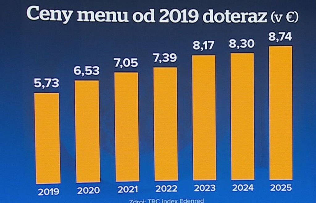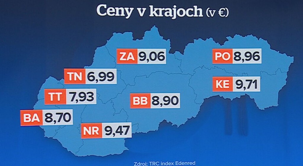 Prieskum TRC indexu spoločnosti Edenred odhalil priemerné ceny obedov za rok 2025, za tento rok zatiaľ dáta nemáme. Najlacnejší je Trenčiansky kraj, naopak najdrahší je dlhodobo Košický kraj.