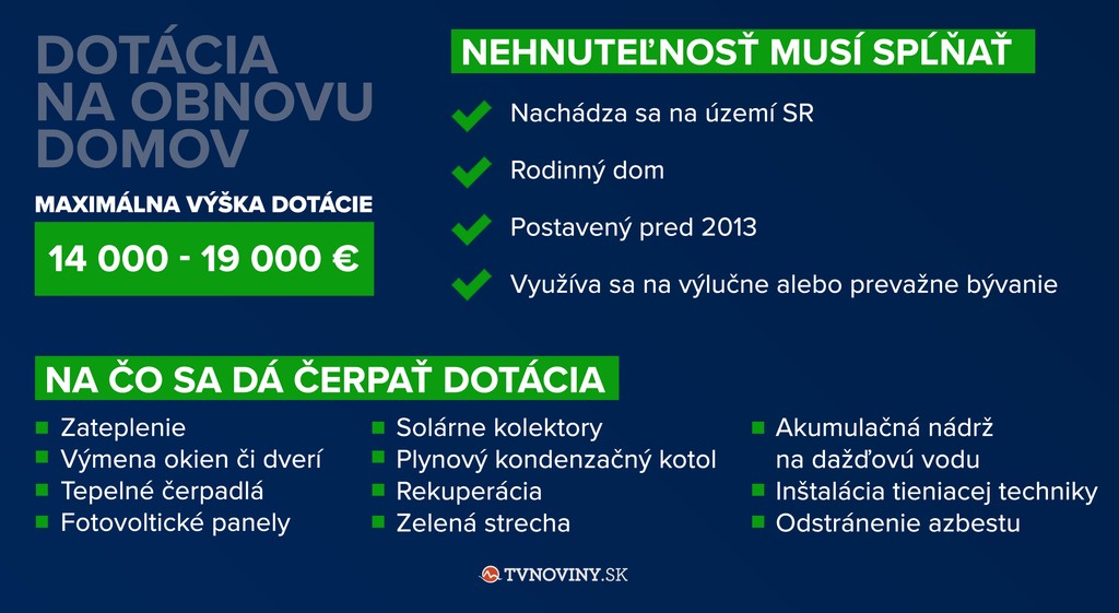 Žiadatelia zo sociálne slabších rodín budú mať preplatených 95 percent nákladov na obnovu domu. Daň z pridanej hodnoty (DPH) z finančných prostriedkov na obnovu uhradí štát. "V extrémnom prípade stačí iba 980 eur na to, aby žiadateľ dostal 19.000 eur na obnovu svojho domu," povedal minister životného prostredia Ján Budaj (OĽANO). Dodal, že pri obnove je podmienkou aspoň 30-percentná úspora energií.
