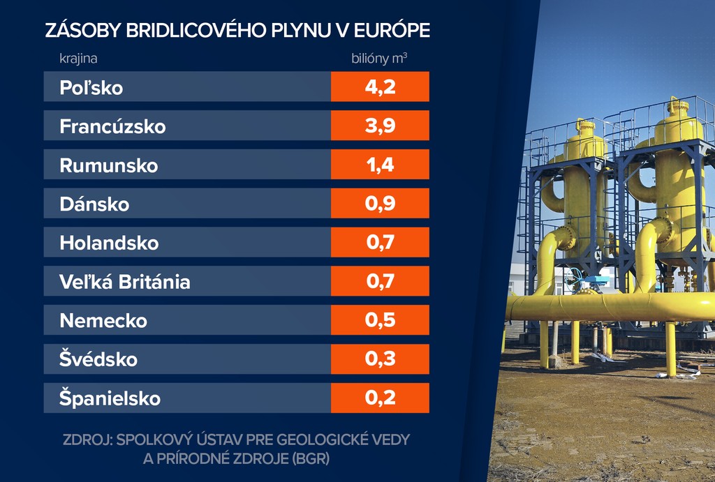 Reč je o bridlicovom plyne, ktorý napríklad v USA spôsobil doslova energetickú revolúciu. Podľa štúdie z roku 2013, ktorú vypracoval nemecký Spolkový ústav pre geologické vedy a prírodné zdroje (BGR) sa na území Európy nachádza približne 14 biliónov kubíkov plynu. Ide o takmer trojnásobok dokázaných rezerv konvenčného zemného plynu, ktoré má Európa (keď nepočítame Rusko) k dispozícii.
