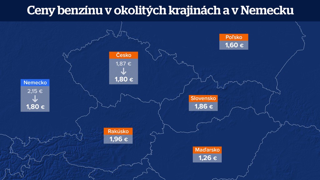 Z pohľadu slovenského motoristu teraz tankujú tí nemeckí a českí lacnejšie. Na Slovensku sa pohybuje liter benzínu na úrovni euro osemdesiatšesť. Nafta je stále lacnejšia. Liter sa predáva za euro sedemdesiatpäť.