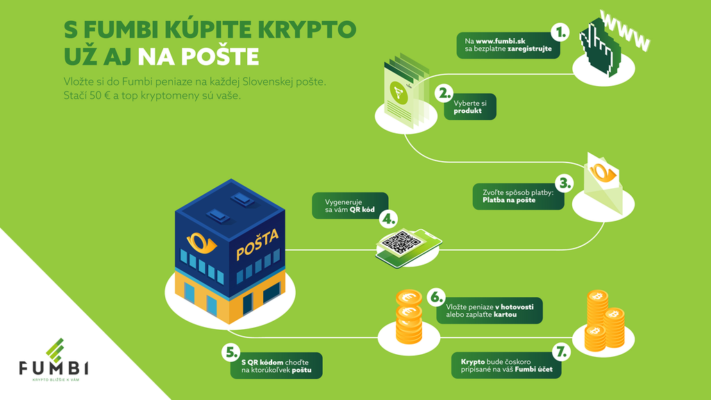 Vo Fumbi si môžete bezpečne, jednoducho a efektívne sporiť s kryptomenami. Táto možnosť je teraz ešte bližšie k ľuďom. Spraviť vklad môžu na každej pobočke Slovenskej pošty. Fumbi má už vyše 100 000 používateľov a rozšírilo sa mimo Slovenska aj do Českej republiky, Maďarska a Poľska. Doteraz mohli používatelia vkladať financie do produktov prostredníctvom bankového prevodu, platby kartou a Rýchleho vkladu, teraz sa k spôsobom pridáva novinka - Platba na pošte. Stačí si pri spôsobe platenia vybrať tento spôsob platby a s vygenerovaným QR kódom zaplatiť na ktorejkoľvek pobočke Slovenskej pošty kartou alebo v hotovosti.