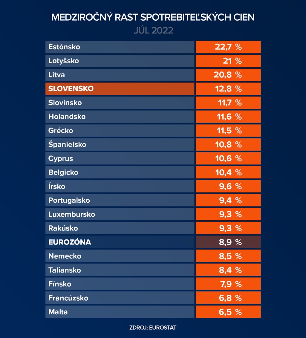 Najvyššiu infláciu v rámci eurozóny zaznamenali v júli pobaltské krajiny. V Estónsku dosiahla 22,7 %, v Lotyšsku sa spotrebiteľské ceny zvýšili medziročne o 21 % a v Litve o 20,8 %. Slovensko zaznamenalo infláciu na úrovni 12,8 %, čo bola štvrtá najvyššia miera inflácie v eurozóne.