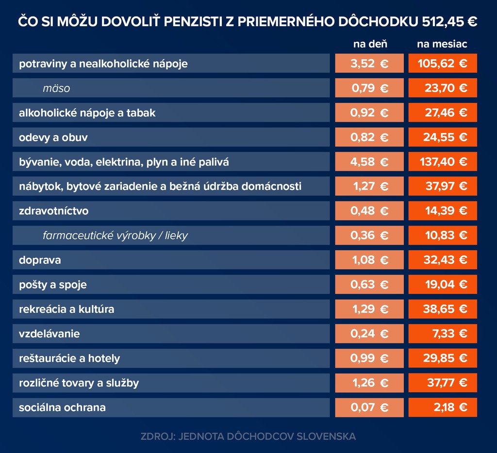 Dôchodca si z priemernej penzie dovolí kupovať potraviny a nealkoholické nápoje približne za 3,50 eura za deň. Mesačne minie na jedlo a pitie takmer 106 eur, pričom na mäso ide z tejto sumy bezmála 24 eur. Viac ako sto eur pritom zaplatí napríklad bežná rodina pri jednom väčšom nákupe.