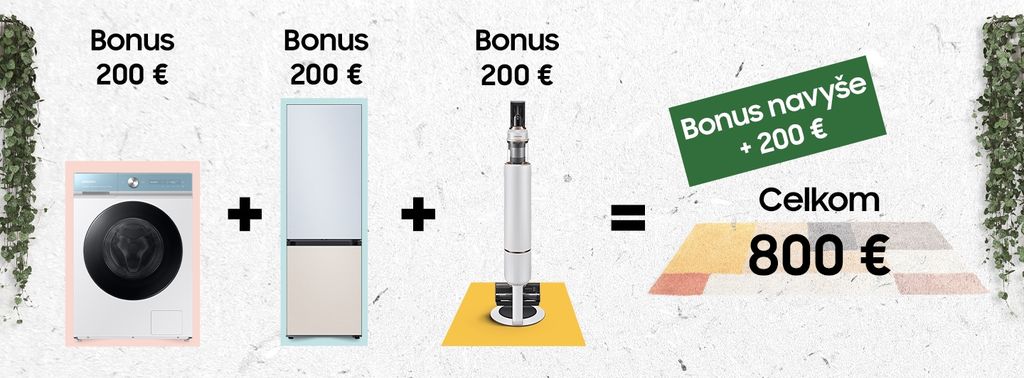 Bonus môžete získať na každý produkt zaradený do akcie Bespoke Home. Získať môžete aj dodatočný bonus pri kúpe troch rozdielnych spotrebičov, celkovo tak môžete dostať späť až 800 eur za jeden uskutočnený nákup.
