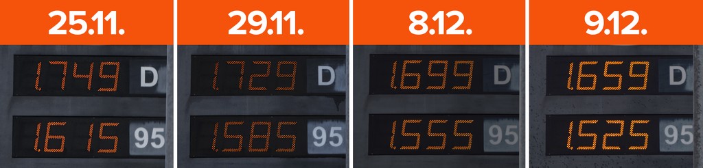 Pád cien sa zvýraznil hlavne v posledných dvoch týždňoch. Od 25. novembra do 9. decembra totiž pumpári skresali benzín aj naftu o deväť centov. V súčasnosti tak liter benzínu môžu motoristi natankovať za euro päťdesiatdva a naftu za euro šesťdesiatpäť.