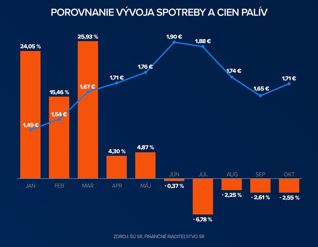 Paradoxne ide o obdobie letných prázdnin a dovoleniek, kedy je za bežných okolností výrazne vyššia mobilita oproti priemeru, čo znamená aj zvýšený záujem o palivá. Trend medziročného poklesu sa už napokon nezastavil do októbra.