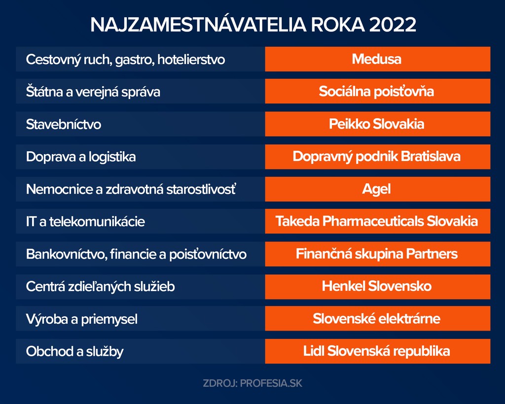 Víťazom 11. ročníka ankety Najzamestnávateľ v kategórii cestovný ruch, gastro, hotelierstvo je gastronomická skupina Medusa. V štátnej a verejnej správe to bola Sociálna poisťovňa (SP). V stavebníctve zvíťazil dodávateľ výrobkov Peikko Slovakia. V doprave a logistike vyhral Dopravný podnik Bratislava. V kategórii nemocnice a zdravotná starostlivosť zvíťazila spoločnosť Agel, ktorá prevádzkuje napríklad nemocnice či pracovnú zdravotnú službu.