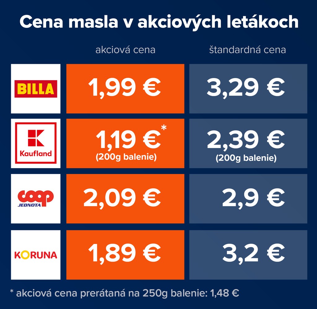 COOP Jednota ho vo svojej privátnej značke ponúkla za 2,09 eura, Billa za 1,99 eura a menšia sieť potravín Koruna takéto maslo predávala za 1,89.