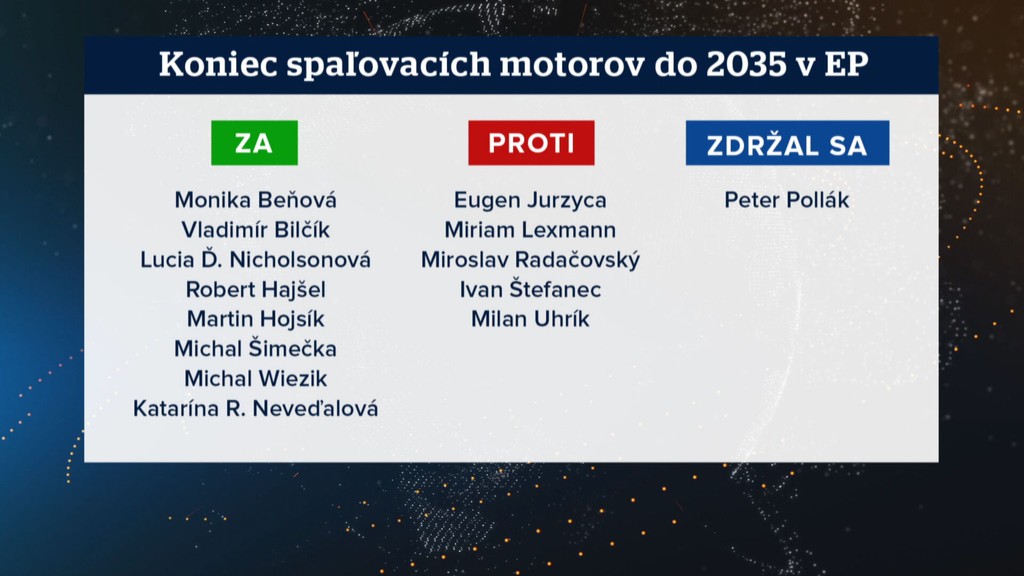 Za koniec spaľovacích motorov bolo osem slovenských europoslancov, proti návrhu piati. Poslanec Peter Pollák sa hlasovania zdržal.