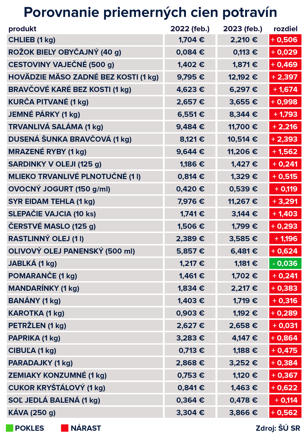 Zákazníci v obchodoch platia výrazne viac v podstate za všetky kategórie potravín. Najviac za mlieko, syry a vajcia (37,1 %), oleje a tuky (32,5 %) a mäso (29,5 %). Nezaostáva ani pečivo či zelenina (25,6 %).
