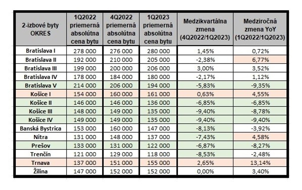 Ceny 2-izbových bytov teda oproti minulému roku najviac poklesli v Bratislave V (o 9,35 %), Košiciach III (o 8,78 %), Košiciach IV (o 9,4 %) a v Prešove (o 8,27 %).
