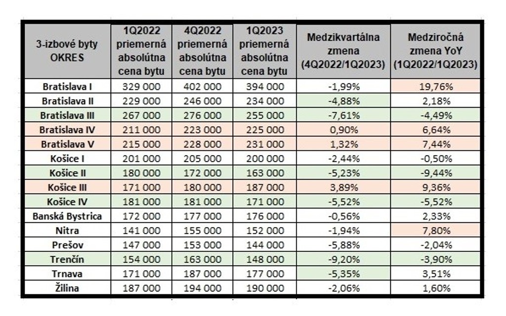 Kým ceny slovenských bytov na konci roku 2022 klesali štvrťročne, v tomto roku je zjavný pokles aj v medziročnom porovnaní. Najvýraznejšie to vidieť pri menších bytoch, kde sú mínusové čísla vo väčšine regiónov.