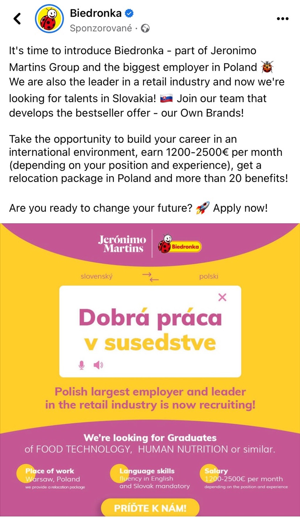 Biedronka je o krok bližšie k Slovensku. Už totiž začala hľadať ľudí do centrály vo Varšave, ktorí ovládajú slovenčinu a angličtinu. Nový tím má vytvoriť priestor pre možnú expanziu. Aj samotný reťazec pre TVNOVINY.sk potvrdil, že spustil proces príchodu na slovenský trh,