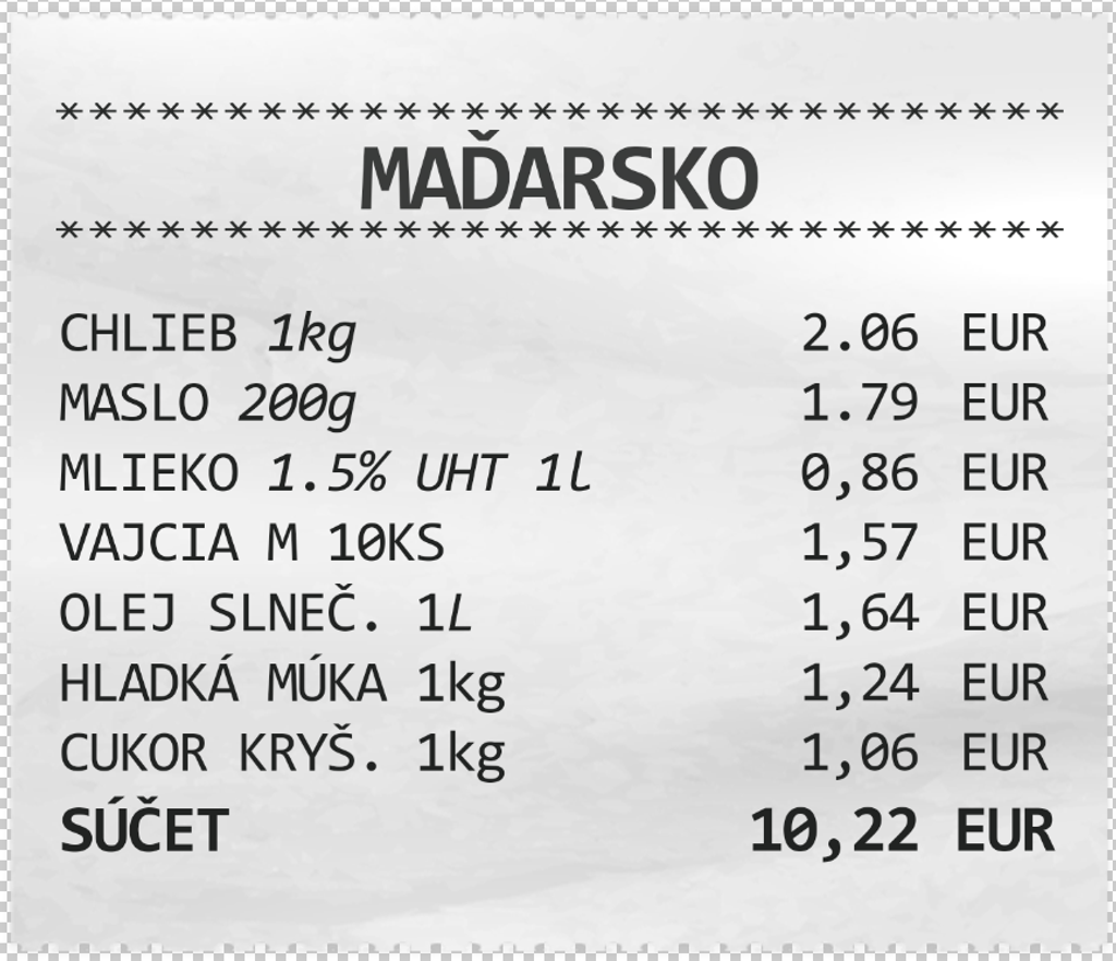 Porovnali sme aj ceny nestropovaných produktov ako chlieb, maslo, mlieko a vajcia. Pri všetkých sú ceny plus mínus rovnaké ako na Slovensku, okrem vajec (10 ks). Za tie zaplatia Maďari až o 80 centov menej.